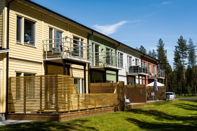 Radhus och lägenheter i Ersboda byggda i trä. Entreprenaden omfattade 16 radhus och 18 lägenheter samt tillhörande förråd, carport och miljörum.