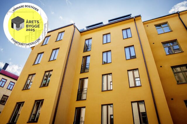 Nybyggnation av bostadshus på en innergård i centrala Stockholm. Huset är byggt md en stomme i KL-trä och vann Årets Bygge 2025, kategori Bostäder.